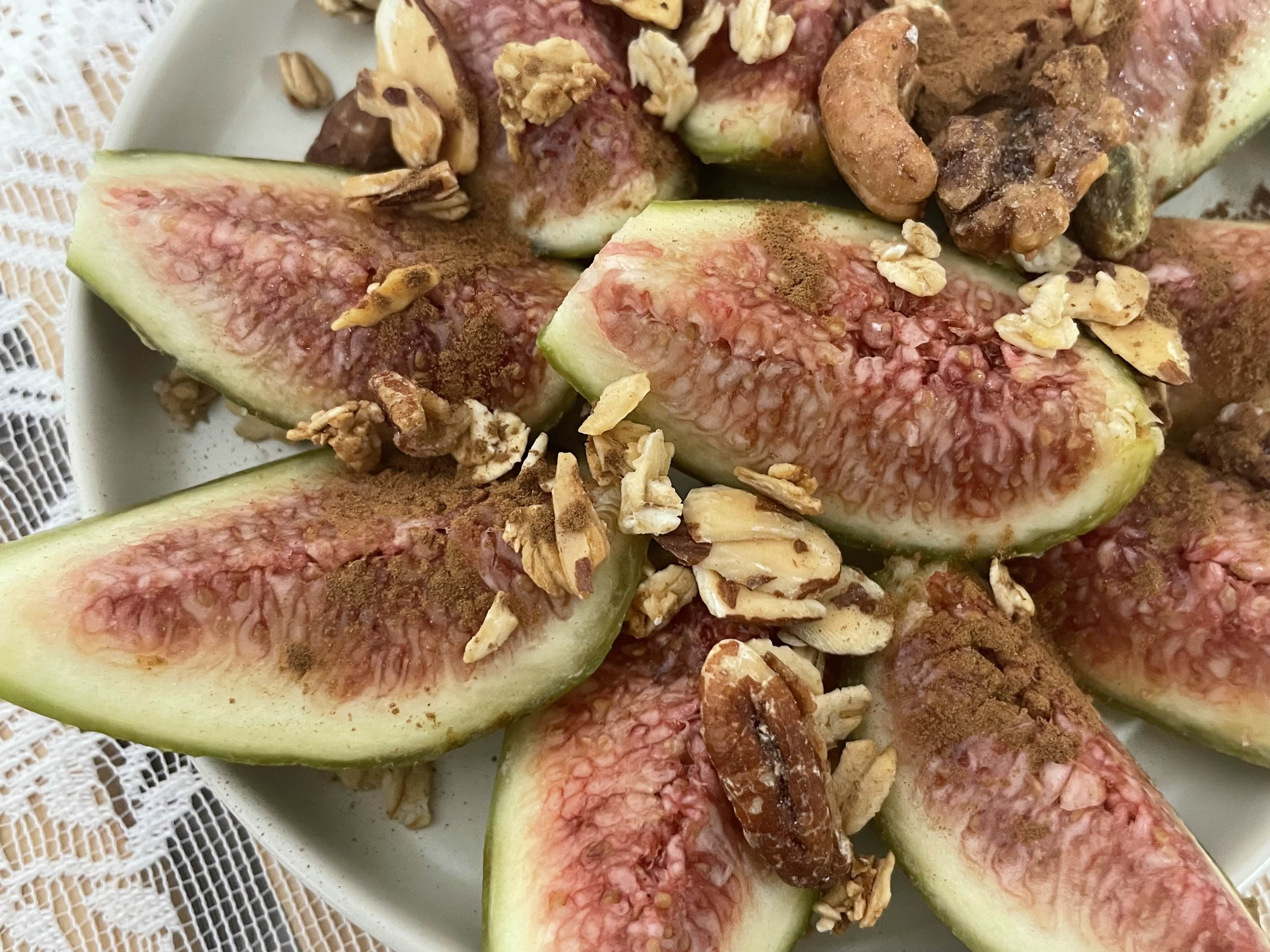 원래 대충 담아 먹을랬는데 무화과부자답게 여유를 부려 보았다. 베이글+그릭+무화과+견과류 뿌셔뿌셔+로즈마리🌿